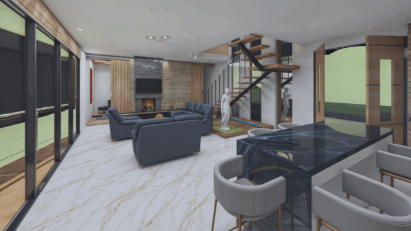 La materialidad combina maderas, piedra, metal y vidrio, creando un ambiente cálido y contemporáneo, mientras que el mármol y una chimenea central aportan sofisticación y confort a la experiencia interior.